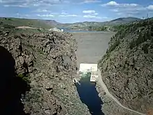 Blue Mesa Dam is a 390-foot-tall (120 m) zoned earthfill dam on the Gunnison River in Colorado. It creates Blue Mesa Reservoir, and is within Curecanti National Recreation Area just before the river enters the Black Canyon of the Gunnison. The dam is upstream of the Morrow Point Dam. Blue Mesa Dam and reservoir are part of the Bureau of Reclamation's Wayne N. Aspinall Unit of the Colorado River Storage Project, which retains the waters of the Colorado River and its tributaries for agricultural and municipal use in the American Southwest.[1][2] Although the dam does produce hydroelectric power, its primary purpose is water storage.[3] State Highway 92 passes over the top of the dam. Blue Mesa Dam houses two turbine generators and produces an average of 264,329,000 kilowatt-hours each year.[4]