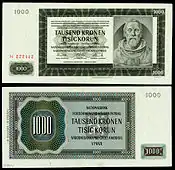 Czechoslovak banknotes for 1 koruna and 5 korun were stamped (and later printed) with "Protektorat Böhmen und Mähren" over "Protektorát Čechy a Morava," and subsequently issued in Bohemia and Moravia beginning on February 9, 1940.[8] These were followed by regular government issues of 1, 5, 50 and 100 korun in 1940,[9] 10 korun in 1942,[10] and 20 and 50 korun in 1944.[11] Nationalbank für Böhmen und Mähren in Prag (National Bank for Bohemia and Moravia in Prague) introduced 500 and 100 korun notes in 1942, followed in 1943 by overprinted Czechoslovak 5000 korun notes. In 1944, the National Bank issued regular 5000 korun notes.[11]