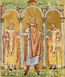 An illustrated Gospel, made for Otto III around 1000, depicted four women symbolising Roma, Gallia, Germania and Sclavinia as doing homage to the Emperor who sat on his throne.[55] Historian Alexis P. Vlasto writes that "Sclavinia" referred to Poland, proving that it was regarded as one of the Christian realms subjected to the Holy Roman Empire in accordance with Otto III's idea of Renovatio imperii[55]—the renewal of the Roman Empire based on a federal concept.[57] Within that framework, Poland, along with Hungary, was upgraded to an eastern foederatus of the Holy Roman Empire, according to historian Jerzy Strzelczyk.[57]