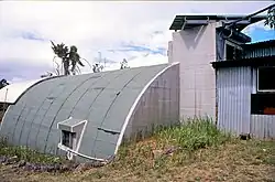 The igloos were built to house the radar electronics and two tonne consoles for the transmitter and receiver. The buildings were intended to be earth covered and were designed with a small tower at one end which was equipped with a ladder and served as a ventilator and escape passage. Entrance doorways at the other end were large enough to accommodate the radar consoles.[1]