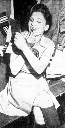 Saskatchewan Mary Baker's eight brothers and sisters were all baseball catchers, so it stood to reason that Baker would become one too. She was scouted by a professional scout, Hub Bishop[2] who also scouted notable Saskatchewan athletes like Gordie Howe of the Detroit Red Wings. When she joined the AAGPBL, she promised her husband, who was fighting overseas in World War II, that she would quit the game when he returned. Baker, 5'5", 135 lbs. (165 cm, 61 kg), a former model, was often chosen by the league to pose for publicity shots and act as a league spokesperson. Baker was the league's most publicized player and was referred to as "Pretty Bonnie Baker" by the press. She appeared on the popular television show What's My Line? on August 17, 1952, and her picture also appeared in Life magazine.