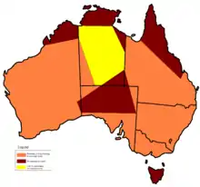 Depictions of boomerangs being thrown at animals, such as kangaroos, appear in some of the oldest rock art in the world, the Indigenous Australian rock art of the Kimberley region, which is potentially up to 50,000 years old.[12] Stencils and paintings of boomerangs also appear in the rock art of West Papua, including on Bird's Head Peninsula and Kaimana, likely dating to the Last Glacial Maximum, when lower sea levels led to cultural continuity between Papua and Arnhem Land in Northern Australia.[13] The oldest surviving Australian Aboriginal boomerangs come from a cache found in a peat bog in the Wyrie Swamp of South Australia and date to 10,000 BC.