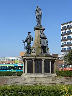 The memorial was built in stone from the Forest of Dean, and the figures are in bronze, cast by the Maneti foundry. The overall height of the memorial is about 7.3 metres (24 ft), and the figures standing on the base are about 2.1 metres (7 ft) high.[2] The base of the monument stands on two circular steps, and has twelve sides divided by pilasters. Between the pilasters are bronze plaques inscribed with the names of the Bootle men who were killed in the World Wars. Standing on the base is a triangular obelisk with concave sides, which carries the figure of a mother holding her child. On the base around the obelisk are three standing figures, a soldier, a sailor, and an airman.[lower-alpha 1] Between the figures are three bronze wreathes. On the west side of the memorial is a plaque commemorating the Liverpool Escort Force of the Second World War.[3][4] An inscription on the monument reads "In grateful memory of over a thousand men from Bootle who made the supreme sacrifice in the Great War, 1914-1918".[4]