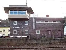 An important step in achieving today's high-capacity line on the left bank of the Rhine was the modernisation of the interlocking technology in the 1970s. Pre-planning and design work for new signal installations in the Boppard area began in 1974. After about two and a half years of construction, the Boppard Bf signalling centre was put into operation on the night of 28 August 1977. It replaced mechanical signalling and safety equipment from the period before the First World War. In 1994, the new entrance building was opened in Boppard. The 1859 station building was originally left standing in accordance with a preservation order,[4] but it had to be demolished in 1989 to permit the relocation of federal highway B 9.[6] The handling of freight in Boppard and on the Hunsrück railway was abandoned, allowing Deutsche Bahn to dismantle the tracks and points at the station from 1998.[7][8] In particular, tracks 5 and 6 and the freight handling facilities were removed. This site is now in the control of the town of Boppard and serves as a parking lot. Remnants of track 5 are still visible.