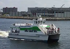 Boston Harbor Cruises offers ferry service from Long Wharf at Christopher Columbus Park to Georges and Spectacle Islands.[13] Free service is available between Georges and Spectacle, as well as between the other islands.[14] Summer service is also available from Hingham Shipyard and Hull to Georges Island via Grape, Bumpkin, and Lovells Islands.[15] (These services are separate from MBTA Boat harbor ferries.)
