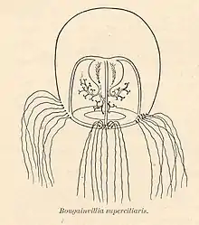 Bougainvillia superciliaris is a marine invertebrate, a species of athecate hydroid. It belongs to the Bougainvillidae family. It can be confused with Rathkea octopunctata, but differs from it in four bundles of tentacles of the outer circle.