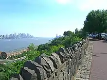 View facing south from Columbia Terrace in Weehawken. Much of the overlook is lined with trap rock quarried from the cliffs.