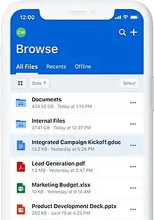 Box began as a simple service for storing, sharing, and syncing files among different users and devices, but developed over time into an enterprise product with features for security and compliance.[28][35][29] Files on Box are encrypted using TLS encryption.[5] Each user has access to their own documents, as well as to corporate files that the IT department manages.[12] IT staff can also set other access and security policies,[12] get audit information like who accessed what files, and receive alerts for suspicious downloads.[32] Box's open APIs allow it to integrate with common business applications.[34][35] For example, one integration allows users to save files to their Box.com folders directly from Microsoft applications.[34] The company also provides consulting, support, and other services.[36]