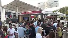 The "pop up parties" have been used by Budweiser events at NASCAR races, and by vitaminwater at NFL tailgate parties. The units can be combined into several stories, or expanded with panels between them to allow for dance floors. The solar power provides electricity for the refrigerators, bars, music decks, even television sets.[1] Setting up a unit of 46 m2 which is complete with a variety of purposes takes twenty minutes.,.[2][3]