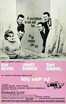 Boys' Night Out is a 1962 American romantic comedy film starring Kim Novak, James Garner, and Tony Randall, and featuring Howard Duff, Janet Blair, Howard Morris, Patti Page, Anne Jeffreys, Jessie Royce Landis and Oscar Homolka. The picture was directed by Michael Gordon and was written by Ira Wallach based on a story by Arne Sultan and Marvin Worth.