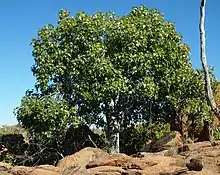 Brachychiton collinus, the outcrop kurrajong, is a small deciduous tree found growing in some of the harshest climatic conditions in Australia.[1] This small tree is commonly found between Cloncurry and Mount Isa in North-West Queensland, Australia. The North-West savannah zone of Queensland is characterised by very high summer temperatures of up to 50 degrees Celsius and an unpredictable monsoonal rainfall that may deliver the whole annual rainfall of some 50 cm overnight. This tree most often grows on rocky outcrops where little other scrub, grasses or other understory plants can survive. It is probable that this preference for bare rocky outcrops is a function of the tree's sensitivity to fire. Most brachychiton species do not survive a strong grass or brush fire.