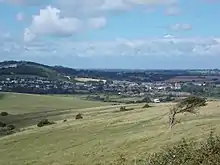 Brading Down is a viewpoint and downland beauty spot,[9] with views over Culver Down and Sandown Bay. From the north side of the hill it is possible to look over the town towards the mainland. From further up visitors can see the Solent and the Spinnaker Tower at Portsmouth. This elevated site is also of archaeological importance,[10] with prehistoric, Roman and medieval remains, as well as practice trenches from the First World War.
