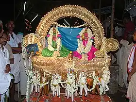 Commonly held in South India, the murtis of a temple's deities are dressed in silk garments, decorated with ornaments, garlands, and other paraphernalia. They are carried from the sanctum to the streets upon palanquins or chariots by adherents, accompanied by musicians and crowds of devotees, who ritually venerate the deity. Brahmotsavas are held in a grand-scale in major temples of Tamil Nadu, such as the Ranganathaswamy Temple of Srirangam, the Nataraja Temple of Chidambaram, and the Meenakshi Temple of Madurai.[3]