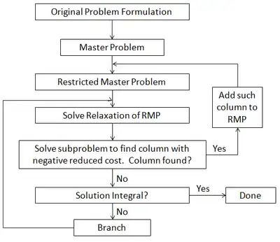 The algorithm typically begins by using a reformulation, such as Dantzig–Wolfe decomposition, to form what is known as the Master Problem. The decomposition is performed to obtain a problem formulation that gives better bounds when the relaxation is solved than when the relaxation of the original formulation is solved. But, the decomposition usually contains many variables and so a modified version, called the Restricted Master Problem, that only considers a subset of the columns is solved.[2] Then, to check for optimality, a subproblem called the pricing problem is solved to find columns that can enter the basis and reduce the objective function (for a minimization problem). This involves finding a column that has a negative reduced cost. Note that the pricing problem itself may be difficult to solve but since it is not necessary to find the column with the most negative reduced cost, heuristic and local search methods can be used.[3] The subproblem must only be solved to completion in order to prove that an optimal solution to the Restricted Master Problem is also an optimal solution to the Master Problem. Each time a column is found with negative reduced cost, it is added to the Restricted Master Problem and the relaxation is reoptimized. If no columns can enter the basis and the solution to the relaxation is not integer, then branching occurs.[1]