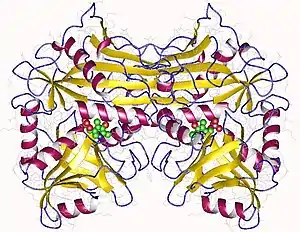 : CS1 maint: overridden setting (link) - ↑ Okada K, Hirotsu K, Sato M, Hayashi H, Kagamiyama H (April 1997). "Three-dimensional structure of Escherichia coli branched-chain amino acid aminotransferase at 2.5 A resolution". Journal of Biochemistry. 121 (4): 637–41. doi:10.1093/oxfordjournals.jbchem.a021633. PMID 9163511.