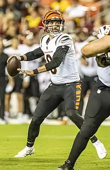 On August 1, 2020, Allen was signed by the Cincinnati Bengals.[25] He was released on September 5, 2020, and signed to the practice squad the next day.[26][27] He was promoted to the active roster on November 23, 2020, after starting quarterback Joe Burrow suffered a season-ending injury.[28] On November 25, 2020, the team announced that Allen would start for the Bengals during their Week 12 game against the New York Giants in place of the injured Joe Burrow.[29] In Week 16, against the Houston Texans, he had 371 passing yards and two touchdowns in the 37–31 victory.[30] Allen started the final game for the season against the Baltimore Ravens, where he completed six of 21 passes for 48 yards, two interceptions, and a passer rating of 0.0 as the Bengals lost 38–3.[31]