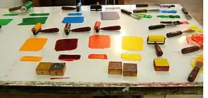 Brayers in the original sense were generally made of wood (though Southward refers to their being made of "wood or glass").[5] Later, rollers could be made of composition, vulcanized rubber, sponge, acrylic, polyurethane or leather. They are formed around a shaft or core and often attached to a wooden handle. Some rollers have an all-metal support, while larger examples may have two handles to allow for two-handed use (to allow the heavy roller to be controlled and in some cases to apply additional pressure).