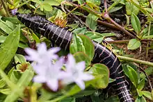 D. lessonae grows to a total length (including tail) of about 30 cm (12 in), and has a lifespan of roughly 10 years. Offspring are zebra-patterned, with white and black stripes circling their bodies. Adults are brown, with red/yellow-coloured heads and undersides, and have small legs.