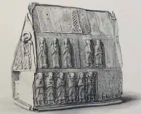 House-shaped (sometimes known as "tomb-shaped") reliquaries date to at least the 8th century.[3] The figures in the Breac Maodhóg are made from bronze, but so finely moulded that they resemble wood carvings.[8] Mostly clerics, saints and apostles, they are placed in groupings, some of which are now lost or badly damaged.[9] The surviving figures are given highly individualistic facial feature, expressions and poses. They wear elaborate hairstyles[10] and are dressed in luxurious finery, and the folds of their flowing robes are highly detailed.[8] The figures are deeply moulded against the copper plates, to an extent that gives the appearance that they have been carved from wood.[11]