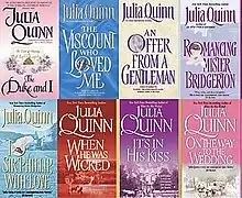 ![]() First edition covers of the first eight novels of the Bridgerton series | |