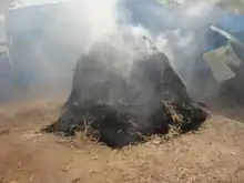 In the third Brahmana, Bhusunda inquires about the method of making sacred ash. The characteristics of the cow whose dung can be used are listed. Dung of brown cow is considered most appropriate. The urine of a cow is suggested to be mixed in the dung. The rituals of extracting of the dung like worship of cow, collecting the urine and dung from its source before touching the ground and associated mantras are told. The mantras for mixing dung with urine, drying balls of the mixture and burning the dried balls are told. The balls are burnt for three days in a Homa (fire-sacrifice), which is fuelled with corn chaff. On fourth day, the ash is extracted and mixed with perfume water or cow urine and various powders like sandalwood, kumkum and so forth. Finally, cakes of this mixture are dried and used as Bhasma. Four types of Bhasma which grant salvation are listed. Anukalpa is the result of Agnihotra and Virujanala fire sacrifices. Upakalpa is created by burning dried cow dung from the forest according to the directives of the Grihya Sutra texts. Upopakalpa is made by burning cow dung with cow urine according to the directives of the Kalpa scriptures. Akalpa is obtained from Shiva temples.[6][7]