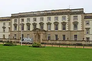 The front of the building is in the Palladian style, with a central block and two wings, all of which have slate roofs. The three-storey central block has a Doric porch and a nine-window range. The wings on either side have six-window ranges. On the southern end is an attached pavilion and on the northern end is the chapel, which contains a window from St Luke's Church, Brislington.[1] The current layout was developed in the mid-19th century from the original separate blocks, which had been linked by a corridor at basement level.[2]