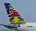 Animals and trees[lower-alpha 1] (Kg'oocoan heé naka hìian theé e) | Cg'ose Ntcox'o | Artist is of the Ncoakhoe People of the Kalahari Desert; depicts seven jackals at an oasis.[23] | Botswana | Boeing 747-400 | G-BNLZ | 8 | ![]() |