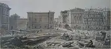 In 1802 a buildings committee was set up to plan for expansion of the museum, and further highlighted by the donation in 1822 of the King's Library, personal library of King George III's, comprising 65,000 volumes, 19,000 pamphlets, maps, charts and topographical drawings.[29] The neoclassical architect, Sir Robert Smirke, was asked to draw up plans for an eastern extension to the museum "... for the reception of the Royal Library, and a Picture Gallery over it ..."[30] and put forward plans for today's quadrangular building, much of which can be seen today. The dilapidated Old Montagu House was demolished and work on the King's Library Gallery began in 1823. The extension, the East Wing, was completed by 1831. However, following the founding of the National Gallery, London in 1824,[lower-alpha 5] the proposed Picture Gallery was no longer needed, and the space on the upper floor was given over to the Natural history collections.[31]