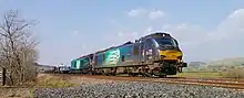 During January 2017, 88002 Prometheus became the first of the class to be delivered to the UK, arriving via the Port of Southampton and being transferred by road to the Carlisle Kingmoor TMD.[9] 88 002 was initially used for homologation purposes to secure approval from the Rail Safety and Standards Board (RSSB) for the type's operation in the UK. All ten Class 88 locomotives were delivered by March 2017.[1] During July 2017, it was announced that the Class 88 had entered into revenue service with DRS in the previous month, three examples having been used to haul freight trains within the first four weeks of operations. Initially, use of the onboard diesel engines was avoided while sufficient training was delivered to all drivers on the class and minor modifications were being made by the manufacturer.[10]