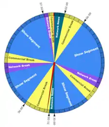 A broadcast clock or format clock is a template that displays a radio or television's hourly format in a graphical representation of a clock. Broadcast programming, especially radio, often follows an hourly pattern where certain segments such as news and commercials are repeated every hour at specific times. A broadcast clock displays these segments graphically which assist broadcasters in scheduling,[1][2][3] thereby avoiding dead air and preventing random program selections by on-air staff.[2]