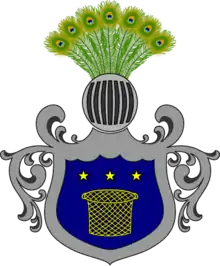 Description: A golden basket under three golden stars. Upon the helm seven green peacock feathers.