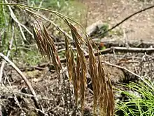 It is a perennial grass which may exceed 1.5 meters in height. The leaf blades may be nearly 2 centimeters wide at the bases. The inflorescence is an open array of spikelets, the lower ones drooping or nodding. The spikelets are flattened and usually hairy or downy.