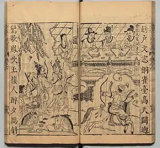 Cao Cao holds a feast on the Bronze Bird Terrace, in chapter 56 of the illustrated 1591 edition of the Romance of the Three Kingdoms novel