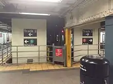 - ↑ Cox, Jeremiah (July 22, 2009). A single High Entrance/Exit Turnstile provides the only way to leave Track 2 at this exit except during rush hour when the turnstiles are open. Retrieved January 16, 2018.