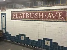 In 1981, the MTA listed the station among the 69 most deteriorated stations in the subway system.[18] As part of a plan to increase accessibility in the New York City Subway, the MTA had planned to install elevators at the Flatbush Avenue–Brooklyn College station by 1995.[19] Starting in December 1993, the station was renovated at the cost of $6 million.[20] An elevator was installed, and the 1920s-style "Flatbush Avenue" name tablets, containing red backgrounds with blue borders, were restored on both platforms.[21] The elevator was closed from July to December 2021 for replacement.[22] The top and bottom of the platform walls contain a blue solid line with a colorful border trim. This results in a tiling scheme with blue tiles that create a wavy pattern that comes farther up whenever there is a "F" tile — which stands for Flatbush — in the station's trimline.[20][23]