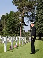 There are two Medal of Honor recipients honored at Brookwood American Cemetery. Gunner's Mate First Class Osmond Ingram was the first sailor to receive the award in World War I. On 15 October 1917, Ingram was serving on the USS Cassin. He spotted an incoming torpedo and attempted to release the ship's load of depth charges before the torpedo struck the ship on the aft side. The torpedo struck the ship before he could accomplish his purpose and Ingram was killed by the explosion.[6] Ingram's body was never recovered; his name is engraved in gold on the wall of the chapel with other crewmen of the Cassin. Also honored is Medal of Honor recipient Gustav A. Sundquist, who fought in the Spanish–American War and who later drowned at sea on August 25, 1918.[7]