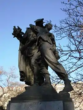 Brotherhood (Czech: Sbratření) is a sculpture by the Czech artist Karel Pokorný (1891-1962), which became the basis for monuments of the Prague Offensive during World War II. There are such monuments in Prague, Česká Třebová, Saint Petersburg and the Crimea. The sculpture depicts the meeting of a Soviet Red Army soldier and a Czech militiaman in May 1945. Art critics evaluate Brotherhood as one of the best works of socialist realism.[1] This sculpture gained popularity and became a symbol of friendship between the peoples of Russia and Czechoslovakia.[2] Its image was used on stamps, coins, banknotes, etc.