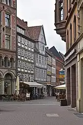 Broyhan House is located at 24 Merchant Street (Kramerstraße) amidst a row of historic half-timbered buildings just west of Market Church,[4] in Hanover's old town. Ownership records for the residential and commercial building typical for early Hanover date back to 1428. The majority of owners were merchants (Kramer)[lower-alpha 2] who conducted their trade within the building.