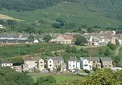 Bryn (meaning: hill) is a village and community in Neath Port Talbot County Borough in Wales. It has a population of 913.[1] The village is located in the hills between Cwmafan, in the Afan Valley, and Maesteg in the Llynfi Valley, approximately 6 miles (9.7 km) from Port Talbot and 2 miles (3.2 km) from Maesteg. The name of the village now familiarly 'Bryn', is Bryntroedygam. So wrote the first vicar of St Theodore's in Port Talbot. There was a farm situated above Meadow Row named Bryn-Troed-y-Garn as shown on the 1876 OS map, as many more immigrants came to 'Bryntroedygam' it seemed the name of the village was to be shorted to Bryn. 12% of the village (112 out of 913 people) speak Welsh.[2] The population rose to 923 by 2011.[3]