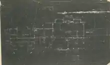 In addition to the stenciling, de Forest's touch can be seen in the incorporation of other Eastern designs and Tiffany glass. De Forest used carved teakwood, like that produced by the Ahmedabad Woodcarving Company, in the molding along the outer edge of the fireplace in Mamie Gwinn's study, as well as some picture frames in the corridor between her and Thomas's study (the Blue Room).[63] In the third expansion of the house in 1908, de Forest decorated the ceiling of the Dorothy Vernon Room with thin sheets of patterned brass in a variety of East Indian designs.[64] Several of the rooms also included Tiffany glass lamps or fixtures that were designed by de Forest and created in the Tiffany Studios.[65]