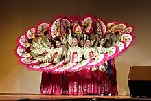This dance is performed at many celebrations and events in Korea, and has become popular worldwide. Dancers use large fans painted with pink peony blossoms to create various formations that represent images such as birds, flowers, butterflies, dragons and waves. The dancers wear brightly coloured hanbok, the Korean traditional dress.[4] The outfit itself is considered an essential element in the overall performance. This includes a traditional Korean hanbok that includes the Chima (skirt) and Jeogori (jacket). The accessories includes various hair accessories such as ornamental hairpins or ribbons. There is also the Buchae (fans) that are large and colorful which adds an eye-catching dynamic to the overall flow of the dance. [5] Buchaechum is usually performed with minyo (folk song) or sanjo (instrumental solo) accompaniment, though court and ritual music is often used as well. The dance is known for showcasing the elegant and graceful aspects of classical technique in a format suitable for modern audiences. [6]