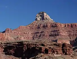 Buddha Temple is a 7,212-foot-elevation (2,198-meter) summit located in the Grand Canyon, in Coconino County of northern Arizona, in the Southwestern United States.[3] It is situated 6.5 miles (10.5 km) due north of the Mather Point overlook on the canyon's South Rim, and four miles southwest of the North Rim's Bright Angel Point. Topographic relief is significant as it rises over 3,800 feet (1,200 meters) in two miles above Bright Angel Canyon to the east, and 3,000 feet in less than one mile above Haunted Canyon to the immediate west. Its neighbors include Manu Temple 1.5 miles (2.4 km) to the northeast, Isis Temple 2.3 miles to the southwest, Zoroaster Temple 3.8 miles to the southeast, and Deva Temple, 3.5 miles to the east. Buddha Temple was named by Henry Gannett, a geographer for Clarence Dutton, in following Dutton's practice of naming features in the Grand Canyon after mythological deities, in this case Buddha.[4][5] This geographical feature's name was officially adopted in 1906 by the U.S. Board on Geographic Names.[3] The first ascent of this butte was made in 1973 by Bruce Grubbs, Chauncey Parker, and Mark Brown via the Northwest Arete.[6] According to the Köppen climate classification system, Buddha Temple is located in a Cold semi-arid climate zone.[7]