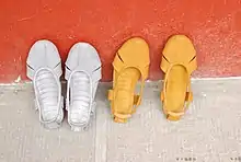 It is common in Buddhist temples to take off one's shoes or change them. In ancient times, shoes were a status symbol and taking them off was, therefore, an expression of humility. It might also have been done to keep the temple grounds clean. Another custom is to put the Buddha image on the highest spot in the room,[39][43] and devotees will prevent raising their head higher than the image or point their feet at the image.[137][18]