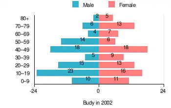 According to the 2002 Poland census, there were 195 people residing in Budy village, of whom 49.7% were male and 50.3% were female. In the village, the population was spread out, with 26.2% under the age of 18, 34.4% from 18 to 44, 21% from 45 to 64, and 18.5% who were 65 years of age or older.[1]