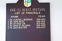 The second headmaster, Mr. David Boler (1966–1978) designed a new school badge when he replaced Mr. McGregor. The top left hand corner of the badge depicts hills which stands for 'Bukit' followed by the top right hand corner which shows a star which stands for 'Bintang', a Malay word meaning star. The bottom left hand corner indicates the national flower 'Bunga Raya' (Hibiscus) and thus represents 'Malaysia.'