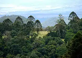 The Wakka Wakka, Jarowair and Barrumgum tribes are the traditional owners for the Bunya Mountains and have inhabited and managed the mountains through traditional land-use management for thousands of years which included the cultural significant "Bunya Feasts" which would see thousands of people from surrounding tribes from Queensland and New South Wales come to the Bunya Mountains for these gatherings.[3][4] The Bunya grasslands are unique relics of a much cooler climate and have existed since the last ice age, persisting due to regular burning by Aboriginal peoples over many thousands of years known as "fire farming".[5] Recent core samples confirmed that Indigenous fire management was occurring on the Bunya Mountains as far back as 9,000 years ago during the Holocene era. Evidence suggests fire farming created the largest estate management in the world of the vast state and territories of Australia, performed in ceremonies, for land control, food control and farming, and produce (native yams) harvesting by Aboriginal people for thousands of years.[5][6] Fire management has enabled the grasslands to maintain their treeless characteristic, preventing rainforest and woodland species from becoming established.[7] The balds are considered a cultural landscape and an enduring symbol of Indigenous land management which still hold significance to Indigenous people today.[4]