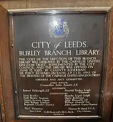 The Burley Branch Library was open on Cardigan Road, Burley, Leeds, West Yorkshire, between 1926 and 2016. It was established on vacant industrial land adjacent to a printing works and railway depot by Leeds City Council, and was majority financed by Carnegie. It is built to a design by Gilbert Burdett Howcroft. The Council closed the library in February 2016 due to its poor condition and being surplus to operational requirements. The building was listed at Grade II in 2017[1] and remains awaiting redevelopment.