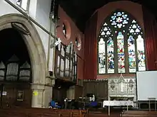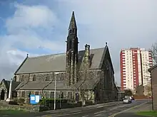 The only historic building in the area is St Agnes' United Church, the Church of England parish church on Stoney Rock Lane. It is a Gothic Revival building with stone walls and slate roof, designed by Leeds architects John Kelly and Edward Birchall. The foundation stone was laid on 9 July 1887 and the completed church was consecrated by the Bishop of Ripon on 20 May 1889.[10][11] It was made the parish church in the 1930s when the church of St Stephen (built 1851) was demolished. The west window stained glass in St Agnes' was originally in St Stephen's. The church has a reredos of Burmantofts faience[10][11] and is a Grade II listed building.[12]