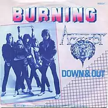 "Burning" is a song by German heavy metal band Accept, from their album Breaker, released in 1981. Written and composed by Wolf Hoffmann, Peter Baltes, Jörg Fischer, Stefan Kaufmann and Udo Dirkschneider, it was also released as a single with "Down and Out" as the B-side. Two other songs on the Breaker album ("Breaker" and "Starlight") were also released as singles in 1981.