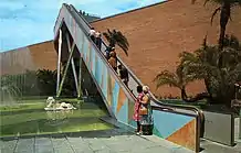 The brewery and gardens officially opened to the public for tours on June 1, 1959, as an admission-free facility with 250 attending the opening ceremony and around 1,000 attendees to Busch Gardens.[18][19] Busch Gardens opened on 15-acre (6.1 ha) of land southwest of the brewery at the cost of around $500,000.[14][15][18][20] The associated gardens featured lagoons and landscaping, with around 36,000 flowering plants and 300 trees.[21][22] Opening animal attractions for Busch Gardens included a bird show in an amphitheater seating around 200 individuals, a bird sanctuary featuring flamingos and a separate animal area named "Devil's Island," and caged enclosures for eagles and cockatoos.[15][23][24] Additional attractions included a dwarf village and the "Hospitality House," a William B. Harvard designed facility that sampled free beer to guests.[23][24][25] Another 118-acre (48 ha) was used for housing the brewers Budweiser Clydesdales, and planned to host buffalo, ostriches, and zebras located east of the brewery.[10][26][27] The original gardens was later dubbed the "Bird Gardens".[28]